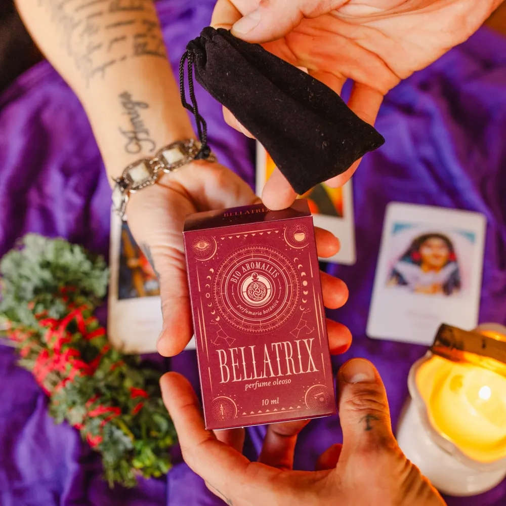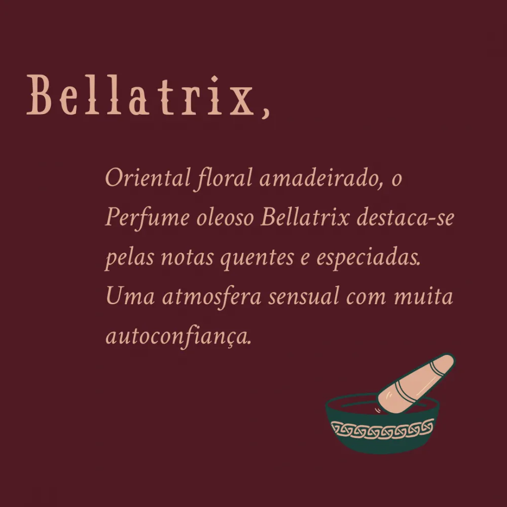 O Perfume Oleoso Bellatrix é um Oriental floral amadeirado. Com notas quentes e especiadas, possui em sua formulação conhecidas notas tidas como afrodisíacas pela cultura popular, como Ylang Ylang e Canela. Um aroma que te conecta com seu próprio poder pessoal.